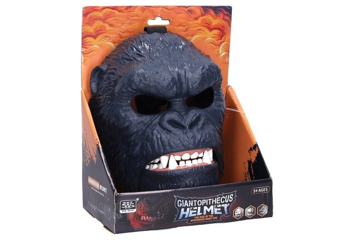 Maska gorila se zvukovými efekty - český obal. Rozměry 17,2x12x24,5 cm. Pohybem hlavy se otevírá čelist, aktivuje se řev. Zvukové efekty. 3xAG13 baterie součástí.