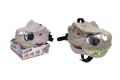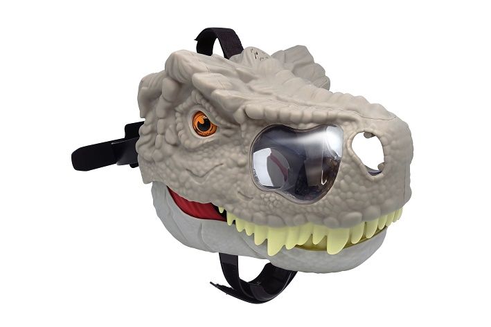 Maska na hlavu dinosaurus s efekty. Velikost 28x22x18cm. Maska se nasazuje na hlavu. Pohybem hlavy se otevírá čelist, a aktivuje se dinosauří řev. Zvukové efekty. 3 polohy otevření čelistí s různými zvuky (vrčení, slabší řev, hlasitý řev). Tlačítko on/off. 2xAAA baterie součástí.