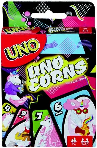 Co se stane, když se spojí dvě věci, které svět miluje? Vznikne skvělá karetní hra UNOcorns™! Vaše oblíbená karetní hra nyní obsahuje karty s rozkošnými obrázky pestrobarevných a kouzelných jednorožců. Hráči se střídají a snaží se co nejrychleji zbavit všech svých karet. Toho dosáhnou tak, že umístí kartu stejné barvy či hodnoty na vrchní kartu odkládacího balíčku. Součástí jsou samozřejmě i speciální akční a divoké karty, které zaručují celou řadu překvapivých chvilek a pomohou vám porazit vaše protihráče. Pokud budete mít v ruce poslední kartu, nezapomeňte zakřičet „UNO“! Hráč, nebo tým, který získá 500 bodů, vyhrává. UNO® je již řadu let oblíbenou karetní hrou, s kterou, jakmile jednou začnete, už nebudete chtít skončit!