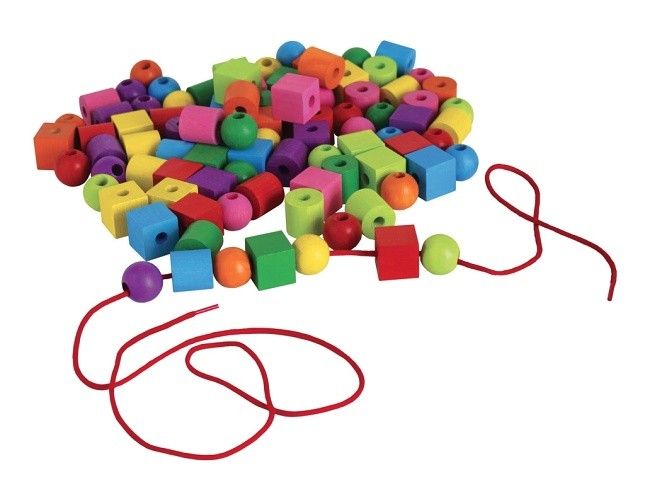 Dřevěné maxiperle různých tvarů o průměru 20 mm se šňůrkou na navlékání v plastovém kyblíku. Výrobek splňuje požadavky EU na bezpečnost hraček a je vhodný pro děti od 3 let.