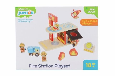Hasičská stanice. Rozměr: 13x26x20cm Set obsahuje: Budovu s garáží a hasičskou tyčí, 2x auto, 1x vrtulník, 3x figurka hasiče, reflektor, 2x oheň. Vláčkodráhy a doplňky Maxim lze kombinovat se všemi dalšími dřevěnými vláčkodráhami na trhu. Pro děti od 18 měsíců.