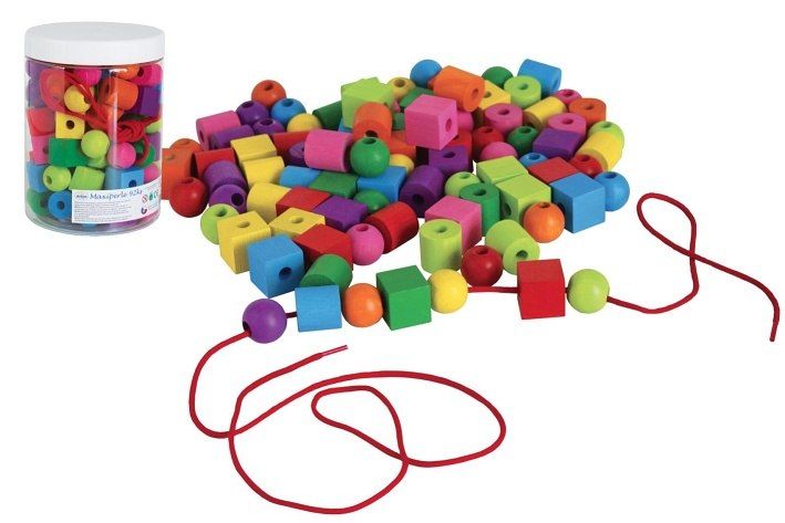 Dřevěné maxiperle různých tvarů se šňůrkou na navlékání v plastové dóze. Výrobek splňuje požadavky EU na bezpečnost hraček a je vhodný pro děti od 3 let.
