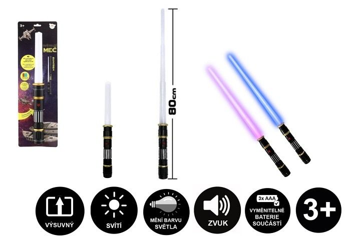 Skládací meč při pohybu mění zvuk, při zasažení cíle vydává zvuk. Svítí a mění barvy. Na baterie 3x AAA, které jsou součástí hračky.
