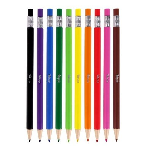 Mechanické hexagonální pastelky s vysouvacím mechanismem. V balení 10 barev. Odolné proti polámání, v hezkém obalu s lenochodem.