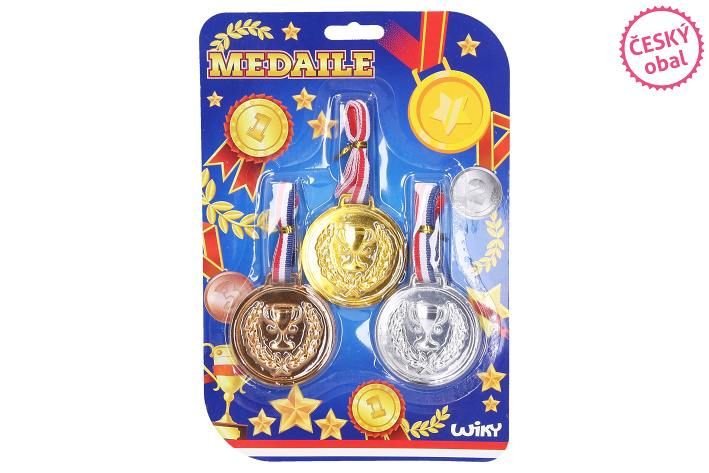 Sada medailí pro děti se stuhou na zavěšení kolem krku. Průměr 5. 5 cm Sada obsahuje 1 zlatou, 1 stříbrnou a 1 bronzovou medaili.