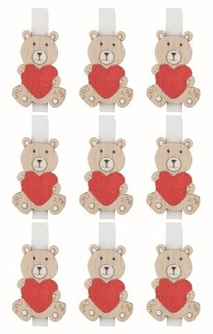 Medvěd se srdíčkem dřevěný na kolíčku 2 x 3 x 0,2 cm, 9 ks v sáčku