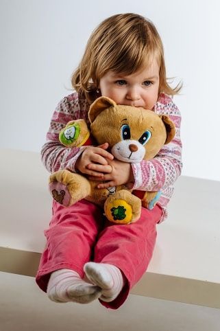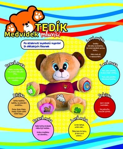 Veselý medvídek Tedík naučí děti 14 známých, českých říkanek např. Paci, paci, pacičky...Mám dvě uši k naslouchání...Čistím zoubky řízy, řízy...atd. Stačí zmáčknout symbol a poslouchat.