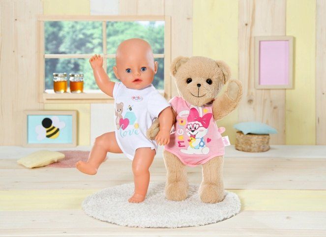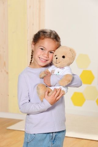 Nový kamarád pro panenky BABY born a pro všechny fanoušky BABY born. Nebo je to kamarádka? Na tom nezáleží, medvídek může být čímkoli: holčičkou, chlapečkem, miminkem, plyšovým medvídkem, kamarádem na hraní, mazlíčkem, princeznou nebo třeba jezdcem na skútru – od útlého věku až do doby, kdy už je dětství jen vzdálenou vzpomínkou.Malý medvídek se sladkým úsměvem má měkké tělíčko. Je oblečen do slušivého bílého oblečku. Má svou vlastní módní kolekci a medvědí doplňky, ale může nosit i téměř cokoliv, co nosí panenka BABY born. Může používat i její doplňky. Medvídek je navržen tak, aby mu sedělo téměř všechno oblečení pro BABY born velikosti 43 cm. Jen její botičky neobuje. Ale který medvídek by potřeboval botičky? Díky pohyblivým ručičkám a nožičkám a otáčecí hlavičce ho lze snadno převlékat. Je velmi pohyblivý, a proto je skvělým společníkem pro hraní různých her. Kdo jako první něco napíše do knížky přátelství? Součástí knížky přátelství je i arch samolepek.• Medvídek BABY born.• Kamarád nebo kamarádka na hraní a mazlení na celý život.• Může si obléknout (téměř) vše pro BABY born.Plyšový Medvídek BABY born velikosti 36 cm. Součástí je obleček, knížka přátelství a samolepky.