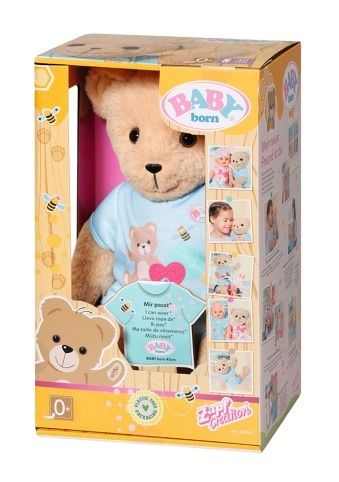 Nový kamarád pro panenky BABY born a pro všechny fanoušky BABY born. Nebo je to kamarádka? Na tom nezáleží, medvídek může být čímkoli: holčičkou, chlapečkem, miminkem, plyšovým medvídkem, kamarádem na hraní, mazlíčkem, princeznou nebo třeba jezdcem na skútru – od útlého věku až do doby, kdy už je dětství jen vzdálenou vzpomínkou.Malý medvídek se sladkým úsměvem má měkké tělíčko. Je oblečen do slušivého modrého oblečku. Má svou vlastní módní kolekci a medvědí doplňky, ale může nosit i téměř cokoliv, co nosí panenka BABY born a také může používat její doplňky. Medvídek je navržen tak, aby mu sedělo téměř všechno oblečení pro BABY born velikosti 43 cm. Jen její botičky neobuje. Ale který medvídek by potřeboval botičky? Díky pohyblivým ručičkám a nožičkám a otáčecí hlavičce ho lze snadno převlékat. Je velmi pohyblivý, a proto je skvělým společníkem pro hraní různých her. Kdo jako první něco napíše do knížky přátelství? Součástí knížky přátelství je i arch samolepek.• Medvídek BABY born.• Kamarád nebo kamarádka na hraní a mazlení na celý život.• Může si obléknout (téměř) vše pro BABY born.Plyšový Medvídek BABY born velikosti 36 cm. Součástí je obleček, knížka přátelství a samolepky.