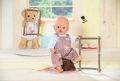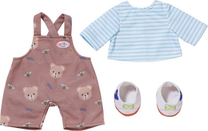 Medvídek BABY born se dnes vyšňořil do úžasného klučičího oblečku. Hnědé lacláče zdobí potisk veselých medvědích obličejů a létajících včeliček. Pod kalhotami má plyšový kamarád oblečeno bílé tričko s modrými pruhy. Vodorovné pruhy medvídky zeštíhlují a v