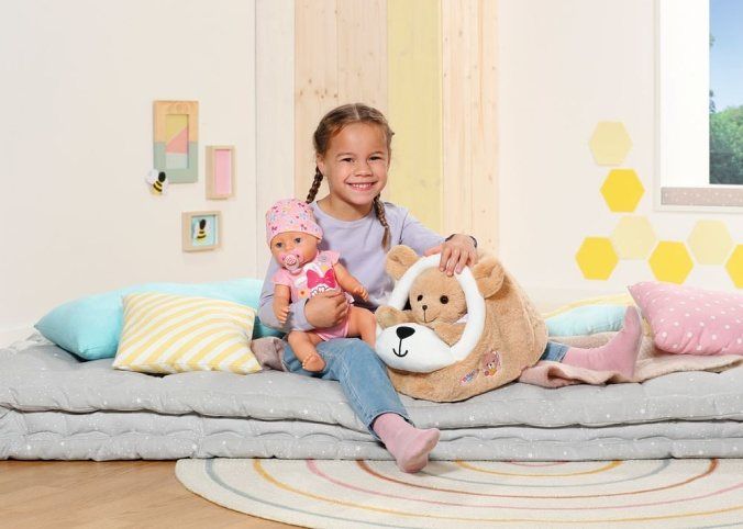 Panenka BABY born bydlí v dětském pokoji a má svou vlastní postýlku. Medvídek BABY born má samozřejmě také svůj domov a své místo na spaní – roztomilý, pohodlný a bezpečný medvědí pelíšek.