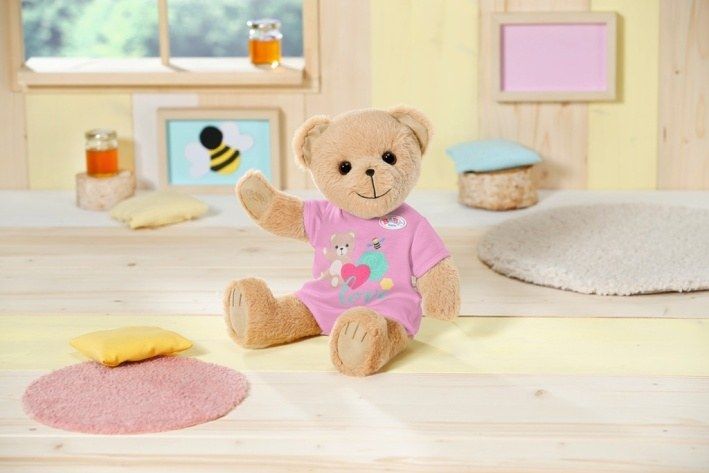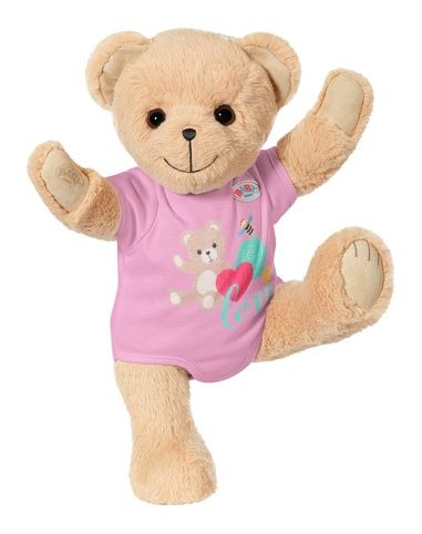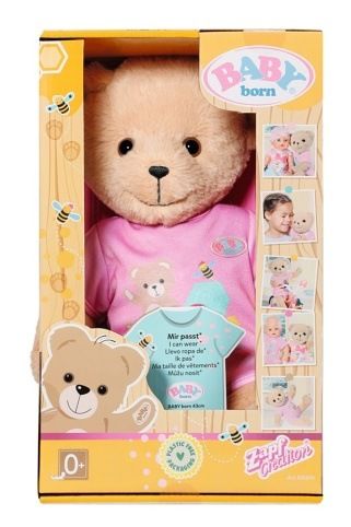 Nový kamarád pro panenky BABY born a pro všechny fanoušky BABY born. Nebo je to kamarádka? Na tom nezáleží, medvídek může být čímkoli: holčičkou, chlapečkem, miminkem, plyšovým medvídkem, kamarádem na hraní, mazlíčkem, princeznou nebo třeba jezdcem na skútru – od útlého věku až do doby, kdy už je dětství jen vzdálenou vzpomínkou.Malý medvídek se sladkým úsměvem má měkké tělíčko. Je oblečen do slušivého růžového oblečku. Má svou vlastní módní kolekci a medvědí doplňky, ale může nosit i téměř cokoliv, co nosí panenka BABY born a také může používat její doplňky. Medvídek je navržen tak, aby mu sedělo téměř všechno oblečení pro BABY born velikosti 43 cm. Jen její botičky neobuje. Ale který medvídek by potřeboval botičky? Díky pohyblivým ručičkám a nožičkám a otáčecí hlavičce ho lze snadno převlékat. Je velmi pohyblivý, a proto je skvělým společníkem pro hraní různých her. Kdo jako první něco napíše do knížky přátelství? Součástí knížky přátelství je i arch samolepek.• Medvídek BABY born.• Kamarád nebo kamarádka na hraní a mazlení na celý život.• Může si obléknout (téměř) vše pro BABY born.Plyšový Medvídek BABY born velikosti 36 cm. Součástí je obleček, knížka přátelství a samolepky.