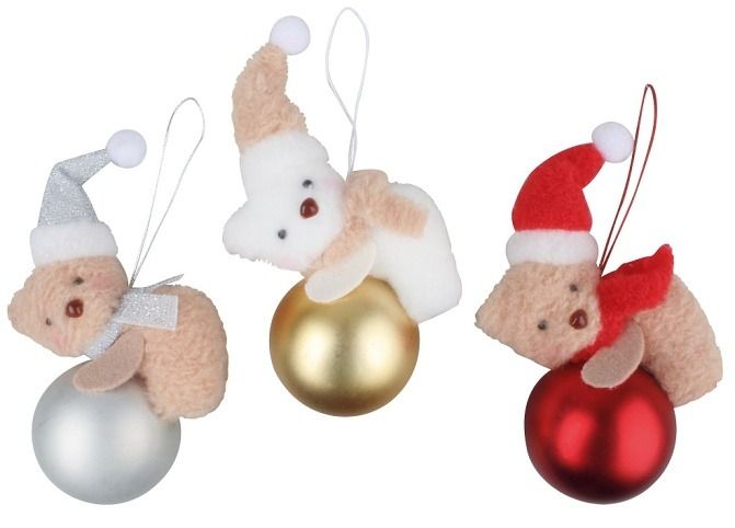 Plyšový medvídek na baňce k zavěšení Roztomilý plyšový medvídek houpající se na baňce jistě udělá radost malým i větším! Díky mašličce si ho můžete snadno zavěsit třeba na stromeček. Tři motivy, dodáváme mixem.
