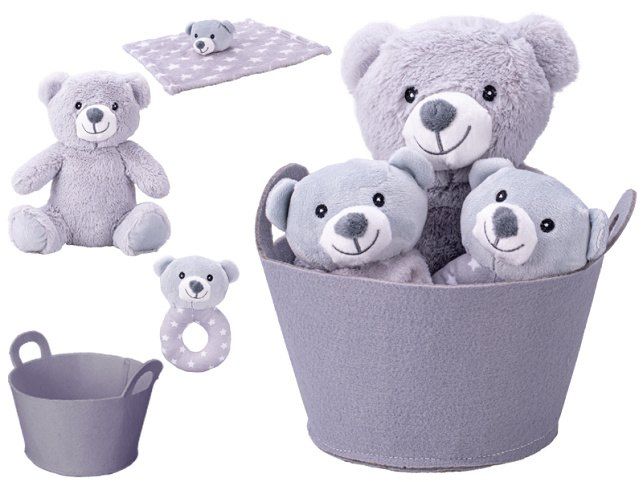 Medvídek plyšový 20cm šedý sedící s chrastítkem 13cm a usínáčkem v košíku 0m+v sáčku