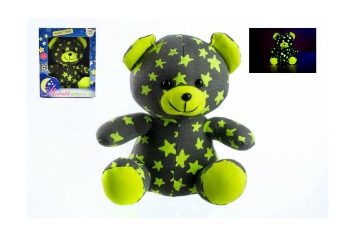 Medvídek svítící ve tmě 21cm šedý/žlutý plyš v krabici.