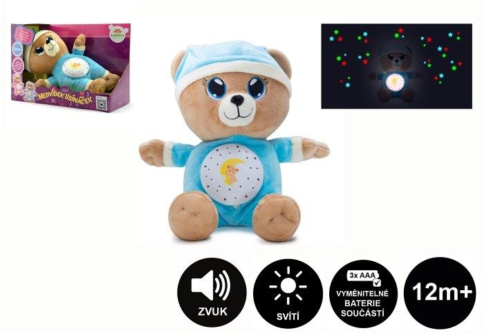 Medvídek Usínáček modrý plyš 32cm na baterie se světlem a zvukem v boxu 12m+