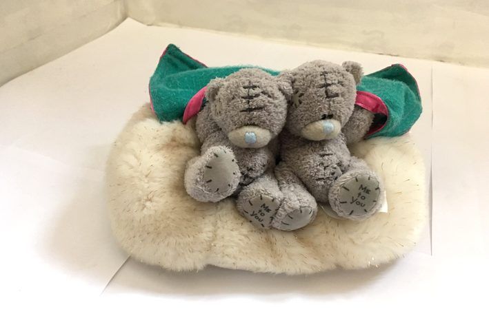 Dva maličcí plyšoví medvídci na chlupatém gauči. velikost gauče: cca 18x13cm.