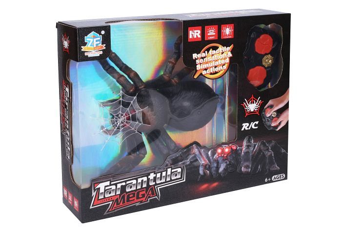 Mega Tarantule RC na dálkové ovládání. Rozměry 26,5x24x8 cm. Infračervený port. Světelné efekty očí. 4xAAA baterie do tarantule a 3xAAA baterie do ovladače nejsou součástí. Provoz až 60 min, dosah 8 m. Ovladač - tlačítko chůze dopředu, tlačítko chůze dozadu, tlačítko otáčení vlevo, tlačítko otáčení vpravo, tlačítko demo režim, přepínač kanálů A,B,C. Přepínač ON/OFF na spodní straně tarantule.