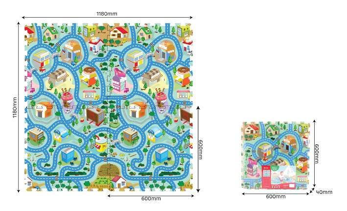 Měkké bloky, motiv město. Balení obsahuje 4 ks. Rozměry 60 x 60 cm, tloušťka 1 cm.