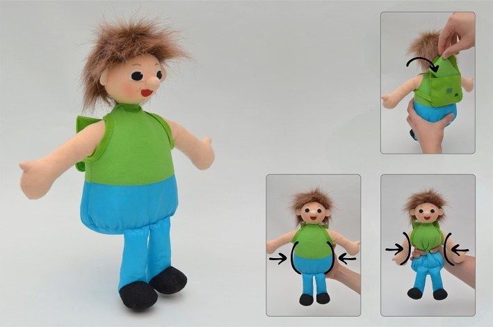 Na omak měkká postavička, která symbolizuje měkké souhlásky. Slouží k učení rozdílů mezi tvrdými a měkkými souhláskami. V batohu má měkký polštářek. Ve spodní časti jsou „fazolky“, tak aby se dal snadno posadit. Zelená barva trička je jako měkká tráva.