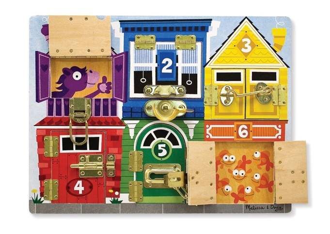 Tato dřevěná učební deska naučí děti otevírat různé zámky dveří, barvy, čísla a zvířátka. Rozvíjí jemnou motoriku.