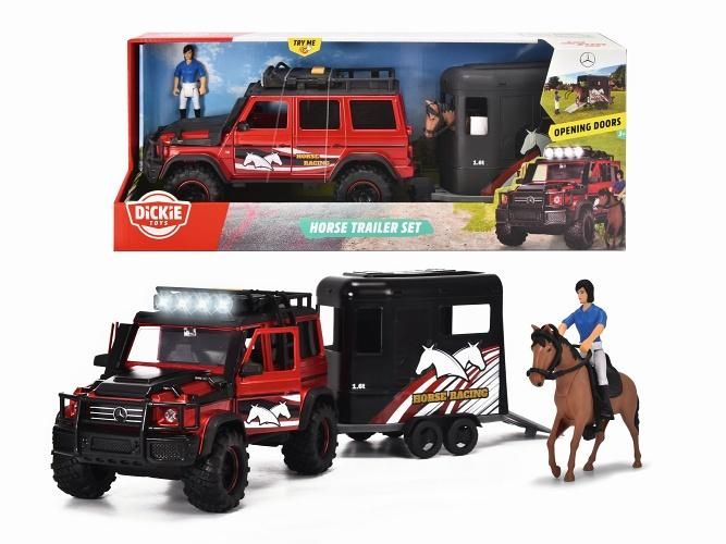 Auto Mercedes-Benz AMG 500 4x4 na volnoběh s přívěsem, včetně koně, s otevíracími dveřmi, se zvukovými a světelnými efekty, s kloubovou figurkou žokeje. V měřítku 1:24. Délka 40 cm.