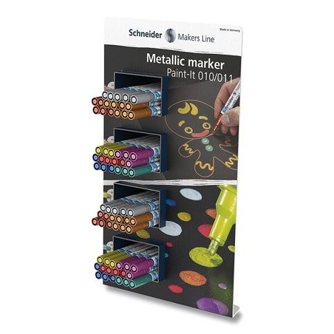 Stojánek obsahující 70 ks speciálních metalických popisovačů Schneider Paint-It 010/011. Popisovače jsou vhodné pro použití na celou řadu povrchů – ideální na tmavé, nesavé povrchy. Rychleschnoucí inkoust. Rovnoměrný průtok inkoustu je regulován ventilem.