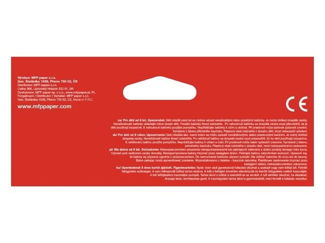 Varování: Děti se mohou prasklými či vyfouknutými balónky zadusit nebo uškrtit. Používejte pouze pod dozorem dospělé osoby. Dospělá osoba se po nafouknutí balónku musí přesvědčit, že jej děti používají bezpečně. Vyfouklé balónky udržujte mimo dosah dětí a prasklé ihned zlikvidujte. K nafukování balónků použíjte pumpičku. Nepřibližujte balónky k očím a obličeji. Při prasknutí může balónek způsobit zranění. Vyrobeno z přírodního kaučuku, latexu. Určeno k dekorativním účelům. Nebezpečí vdechnutí a spolknutí malých částic.