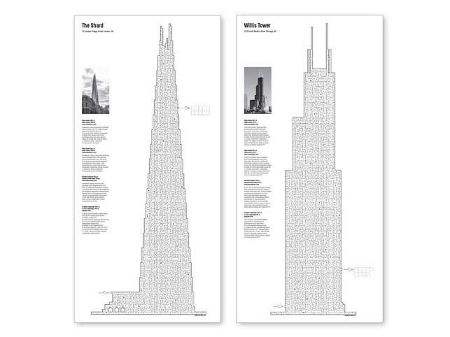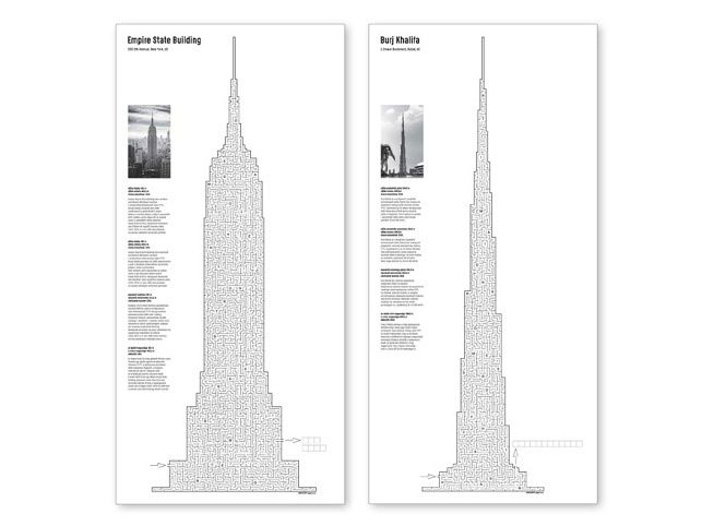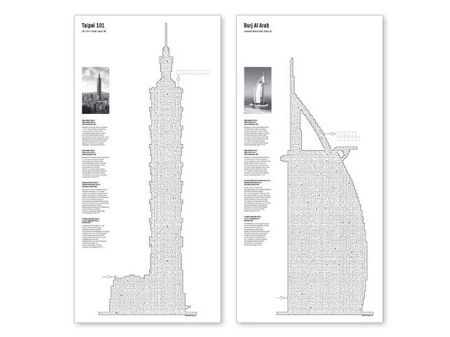 Bludiště s tajenkou velikosti 630x297mm, 6 různých bludišť ve tvaru světoznámých mrakodrapů.