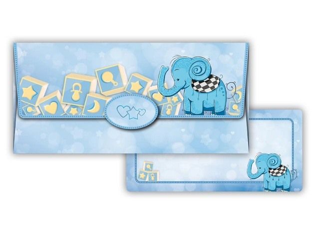Dárková obálka na peníze s motivem pro miminka - Udělejte novopečeným rodičům radost a věnujte jim obálku s penězi. Uvnitř je kartička bez textu, na kterou můžete napsat věnování. PROVEDENÍ: modrá se slonem, vhodná pro malého chlapečka Uvedená cena je za 1 ks.