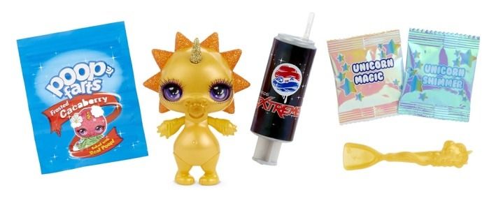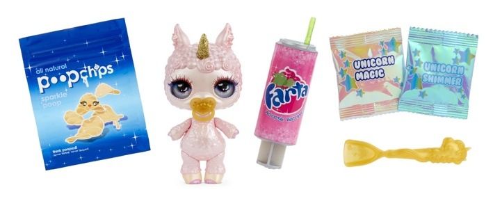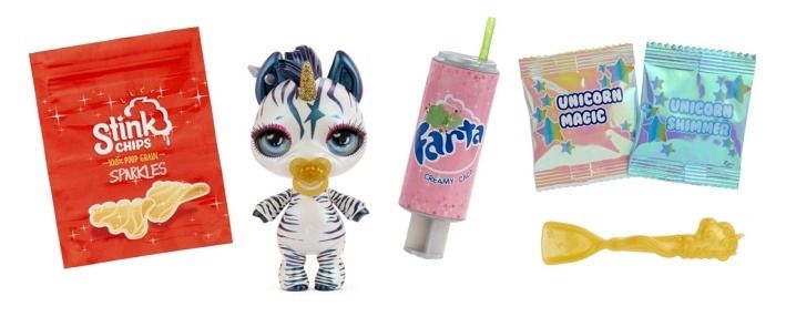 Obsah balení: 1 Třpytivá potvůrka(sesbírej jich 15+) 1 láhev ve tvaru stříkačky 1 sáček s práškem se speciálními efekty (Unicorn Magic) 1 sáček s drobnými třpytkami (Unicorn Shimmer) 1 sáček se třpytkami (Unicorn Sparkle), vzácné třpytky, nejsou ve všech baleních 1 dudlík 1 obal pro uchování slizu