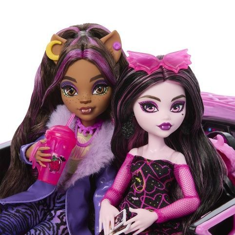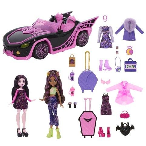 Je pátek odpoledne a na Monster High™ končí škola, proto si monsterky Draculaura a Clawdeen sbalí kufry, nasednou do černé Monstrkáry a vyrazí na pořádný příšerkovský výlet! Tento herní set obsahuje obě panenky, stejně jako příšerně boží auťák a více než