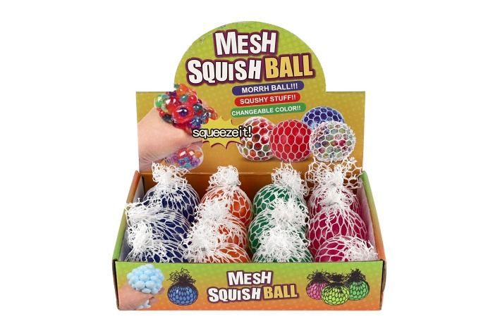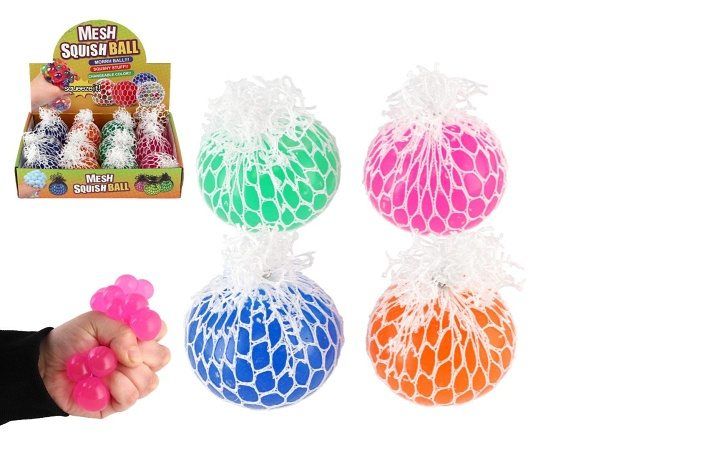 Míček lze všemožně mačkat a hníst v ruce. Při mačkání vylézají z ok síťky bubliny. Vhodné na uvolnění stresu.