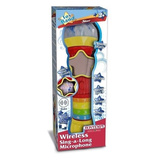 Bezdrátový mikrofon se světelnými efekty,zrcadlem a melodiemi – 2 přednastavené písničky, 4 rytmy, 8 melodií, 3 zvukové efekty, světelné efekty, podsvícené zrcátko, automatické vypínání.
