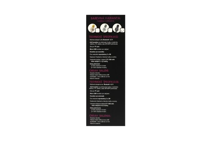 - doba provozu při 50% hlasitosti je 14 hodin, při 100% hlasitosti je 9 hodin.