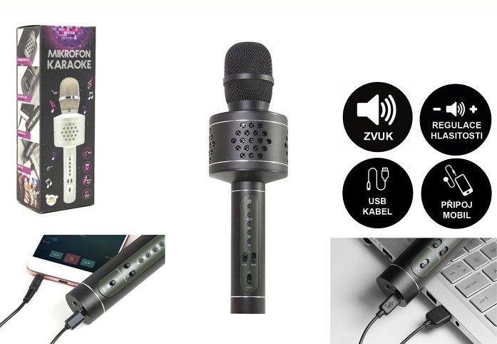 Obsah balení: karaoke mikrofon, nabíjecí kabel USB do Micro USB, audiokabel, návod k obsluze. Barva: černá.