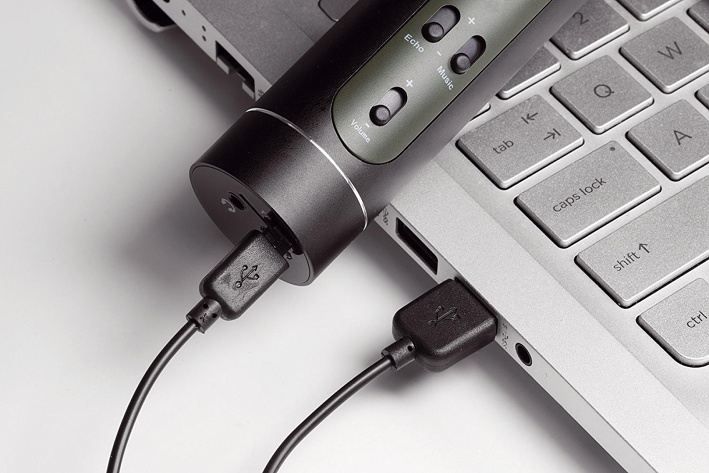 AUX konektor - zapojte kabel s koncovkou do AUX slotu a druhou koncovku USB do mobilu, tabletu, PC nebo MP3. Mikrofon začne přehrávat hudbu, kterou si v připojeném zařízení vyberete a můžete začít zpívat.