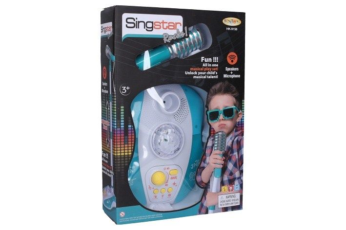Mikrofon se stojanem set. Rozměry 20x26x103 cm. Baterie 4xAA, nejsou součástí balení. 4 demo písničky, 5 rytmů bicích, 5 potlesků, 9 světelných efektů, 5 dalších zvukových efektů. Tlačítko on/off, nastavitelná hlasitost, funkce bluetooth, výškově nastavitelný stojan.