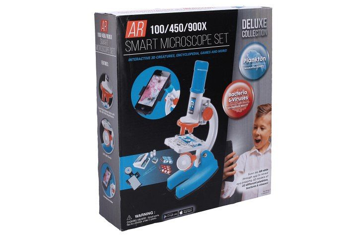 Přiblížení 100/450/900x. Přiložený manuál. Možná instalace nástavce na smartphone. Při snímání kukátka kamerou smartphonu lze prostřednictvím aplikace sledovat 3d modely různých bakterií, virů a planktonu. Nasvícení 2 x AG3/LR41 baterie (součástí).