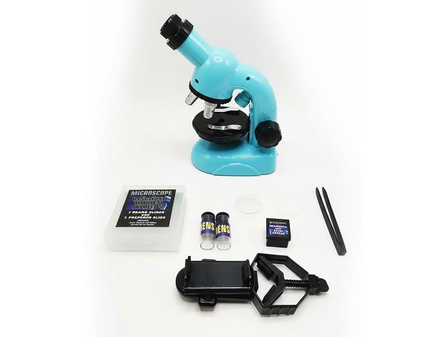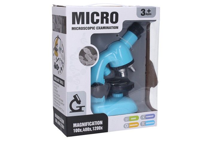 Mikroskop. Velikost 21 cm. Zvětšení 10x, 400x, 1200x. Baterie 2xAA není součástí. Obsahuje mikroskop, držák na mobilní telefon, sadu sklíček, krabičku na sklíčka, pinzetu, misky a lahvičky. Možnost připevnit držákem mobilní telefon a fotit zvětšené vzorky.