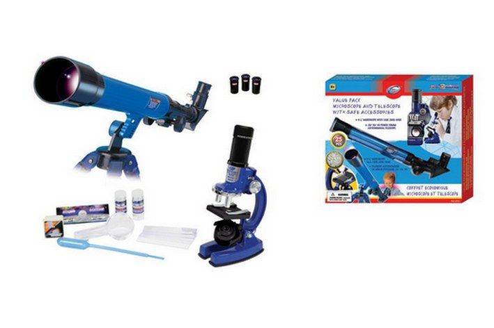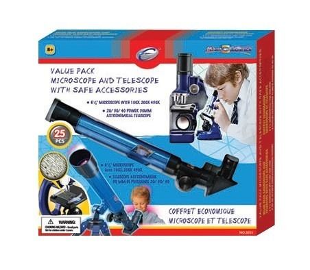 Obsahuje: Mikroskop, teleskop, krycí sklíčka, nádobky na vzorky, štítky, plastová pipeta, lupa, zvětšovací sklíčko. Sada obsahuje celkově 25 ks.