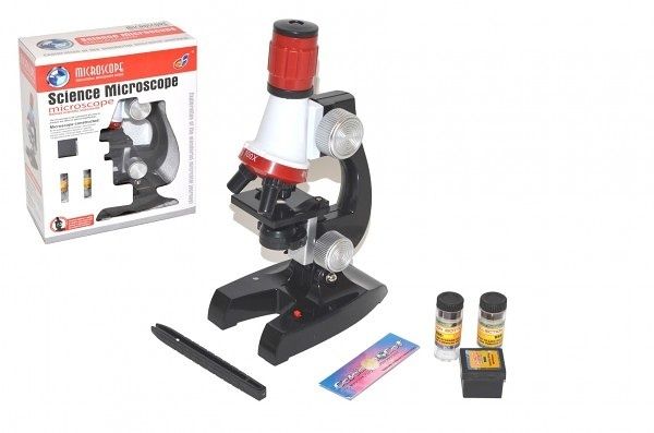 Mikroskop s doplňky plast 10x20cm na baterie se světlem v krabici 19x24x9cm