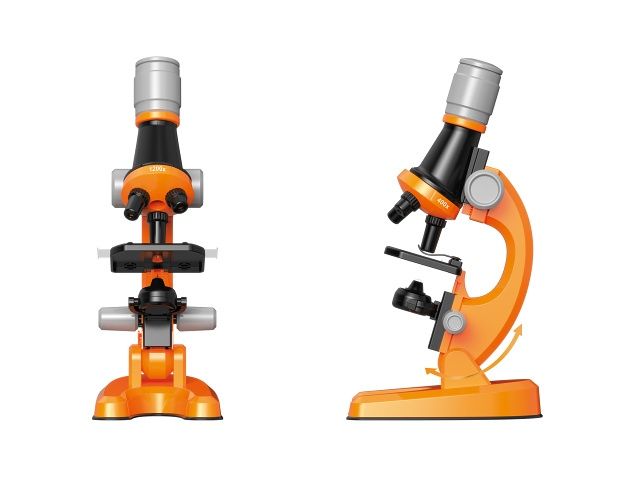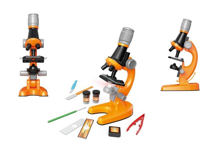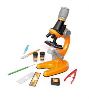 Mikroskop se světlem. Rozměry 15x10x23 cm. Přiblížení 100x, 400x, 1200x. 2xAA baterie nejsou součástí. Součástí sklíčka, 2 tuby, krabička, pinzeta, skalpel (plastový), nožík (plastový), špejle, šroubovák.