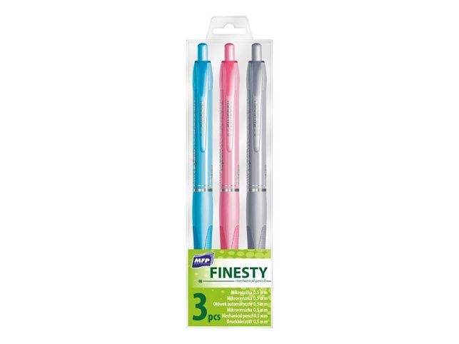 Set 3 ks - mechanické mikrotužky značky Finesty tzv. pentilka s tuhou 0,5mm V horní části tužky se schovává pod vrškem mazací pryž. Tužka je opatřena plastovým klipem. Barva: růžová, modrá, šedá Délka: 150mm Průměr tuhy: 0,5mm Uvedená cena je za 1 balení. Tužky jsou baleny v obalu se závěsem.