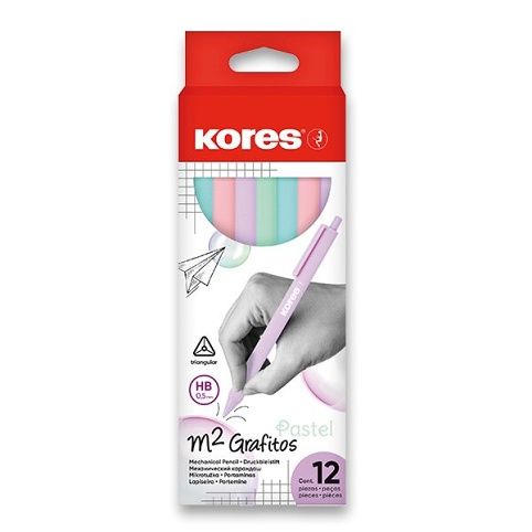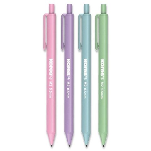 Mechanická tužka Kores M2 Pastel 0,5 bez pryže. Plastové tělo ergonomického tvaru s klipem a zatahovatelným hrotem. Pogumovaný soft povrch pro vyšší komfort při psaní. Obsahuje 2 tuhy. Jeden kus. Tuha o šíři 0,5 mm.