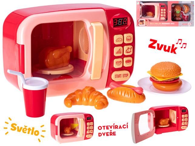 Mikrovlnná trouba 22x15x10cm červená na baterie s doplňky se světlem a zvukem v krabičce