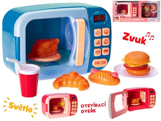 Mikrovlnná trouba 22x15x10cm modrá na baterie s doplňky se světlem a zvukem v krabičce