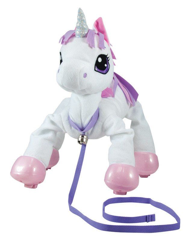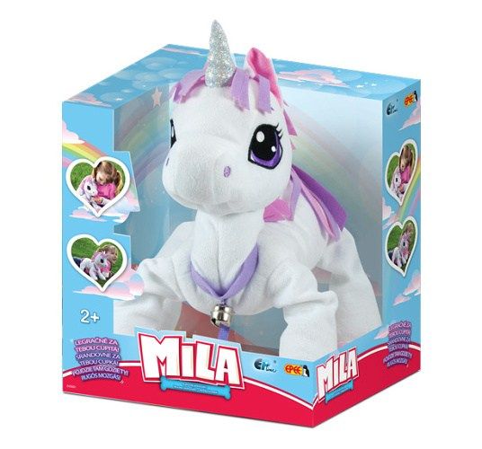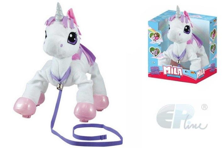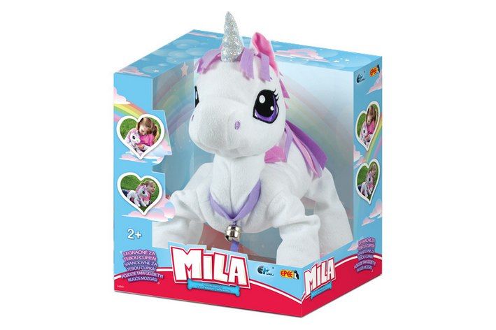 Pořiďte Vašim holčičkám bláznivého jednorožce - Milu! Jednorožec Mila miluje procházky. Chytněte ho za vodítko a sledujte, jak legračně bude za vámi poskakovat, stejně jako opravdový pejsek. Jeho rolnička roztomile cinká. Mila má zdrsněné tlapky, které jsou vhodné pro kterýkoli povrch.