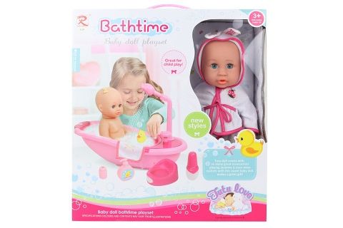 Miminko s vaničkou a doplňky. Balení obsahuje miminko s pevným tělíčkem, vaničku, sprchu, obleček, nočník, kachničku a mnoho dalších doplňků. Sprcha opravdu teče. Rozměry balení cca 36,5 x 40 x 13 cm. Věk 3+