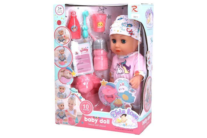 Miminko čurající. Velikost 30 cm. Zvukové efekty. 3xAG13 baterie součástí. Nočník, láhev, hrnek, sprcha, mycí prostředek, dudlík součástí.